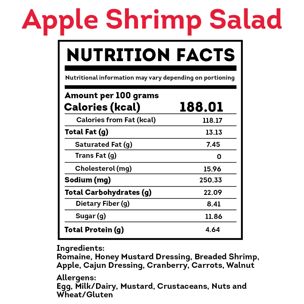 Fresh salad made with crisp romaine lettuce, fried shrimp drizzled with cajun dressing, carrots, apple slices, dried cranberries, caramelized walnuts served with Honey Mustard Dressing.