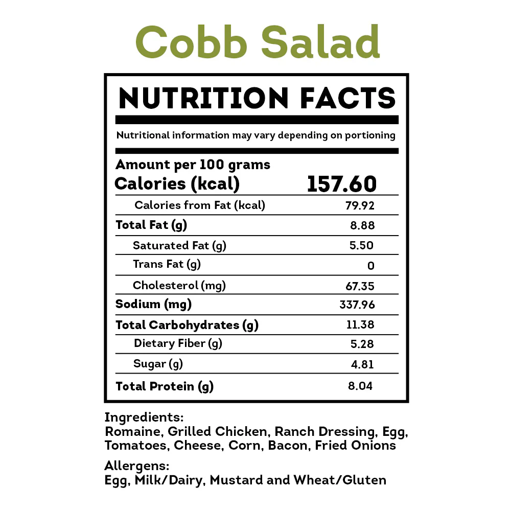 Fresh salad made with crisp romaine lettuce, grilled chicken, tomatoes, shredded cheese, eggs, corn, bacon, and fried onions served with creamy ranch dressing.